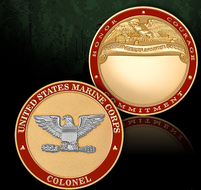 This coin honors those highly skilled and courageous warriors who have risen through the ranks to achieve the status of Colonel in the U.S. Marine Corps. The obverse features a rendering of the rank insignia worn by these proud warriors.