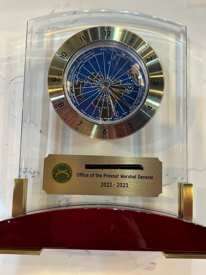 Glass Clock with World Time Dial on Piano Finish Base with Gold Metal Accents. Laser engravable aluminum plate. Individually gift boxed.